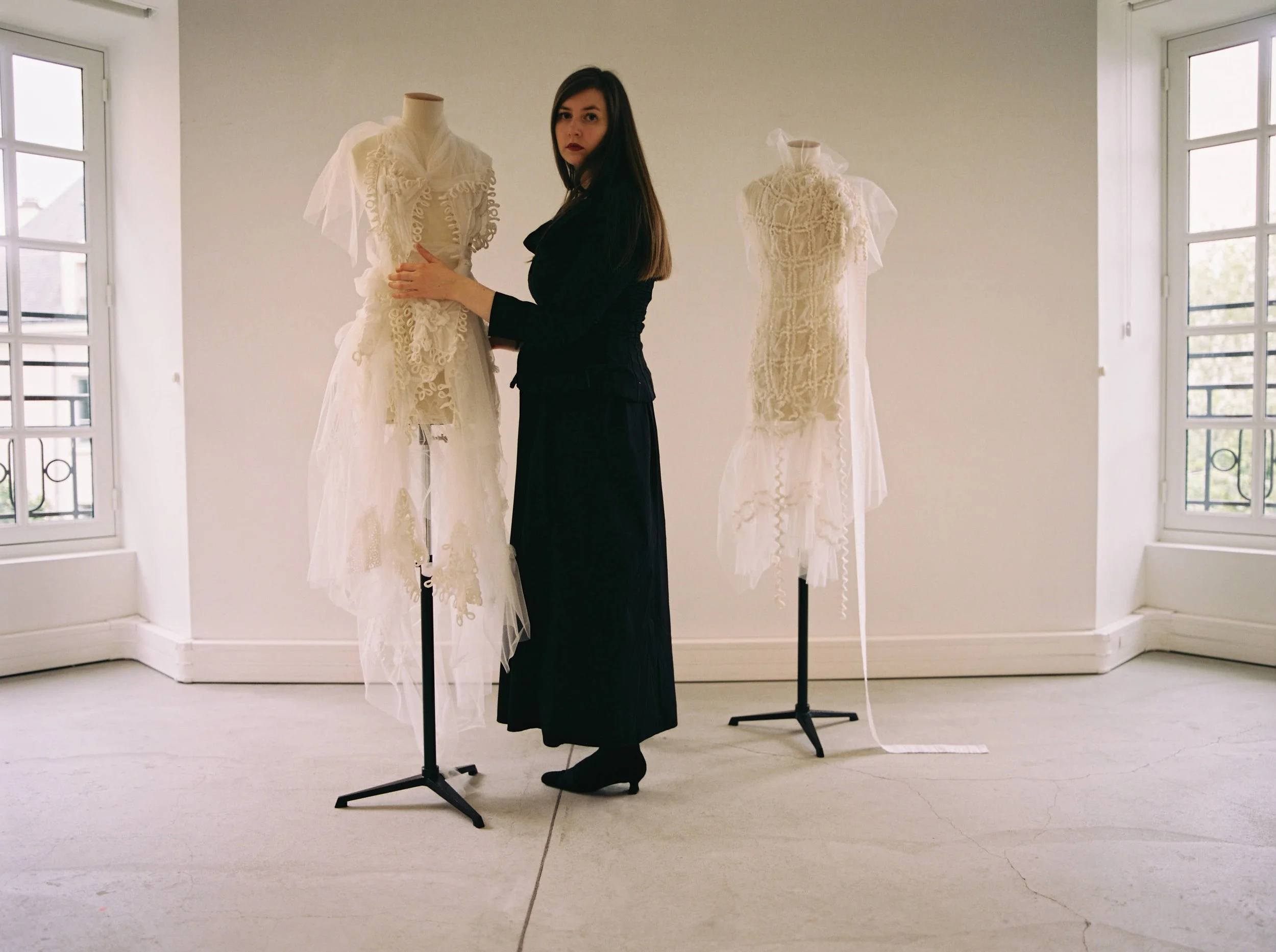 Founder and creative director Pierce operates across multiple design disciplines, bridging fashion, art, sculpture and space, with a focus on material innovation and poetic forms. Her distinguishing textures and three-dimensional structures are the product of an organic, fabric-first process that rebels against industry norms.